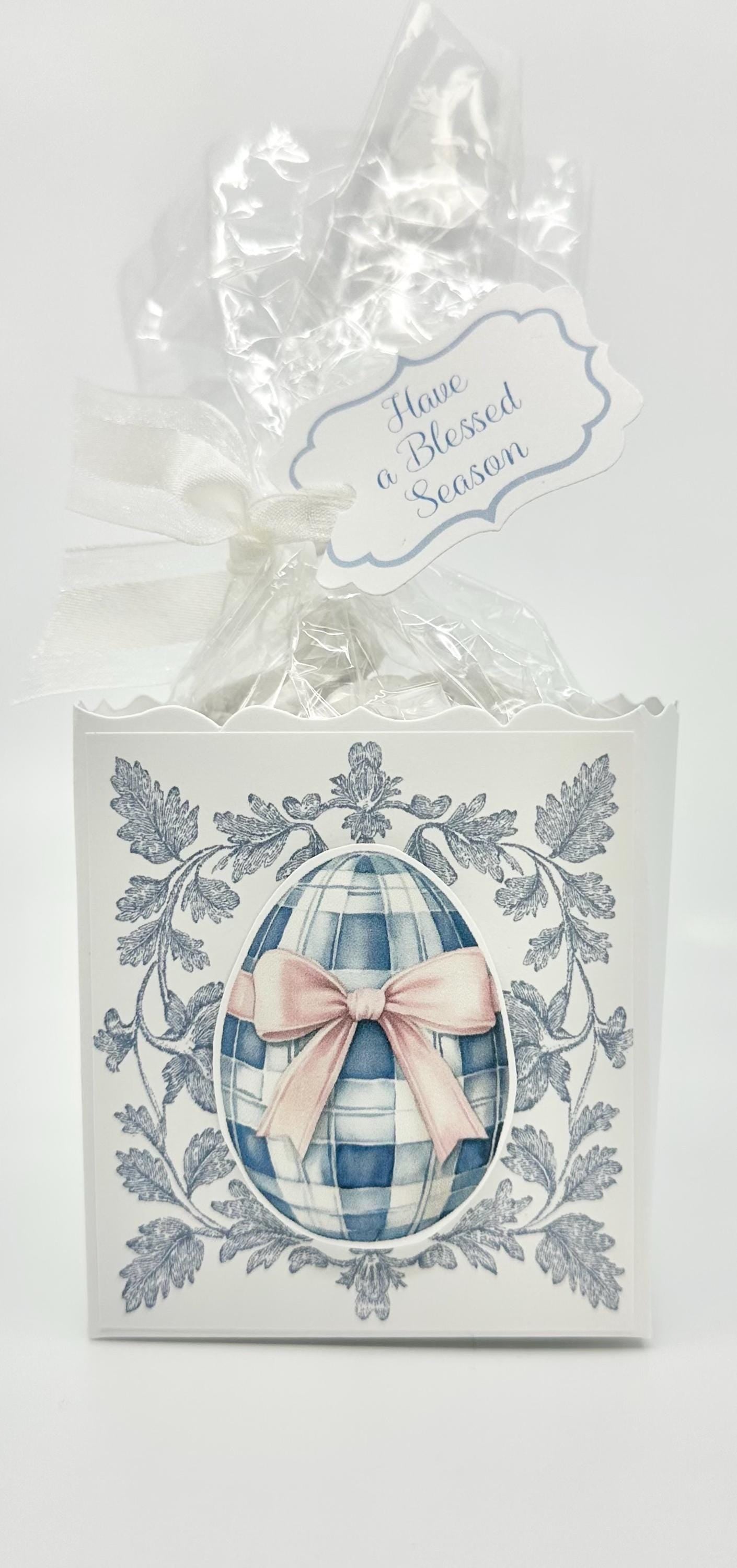 These 3-D Toile Easter Egg Gift Basket Box and Bag Party Favors are perfect to stuff with your own goodies for your guests, traveling visitors and older children for Easter. The egg is popped out from the box, giving a dimensional effect to the favor.