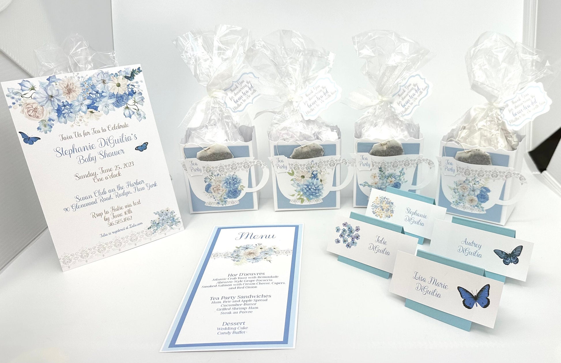 Beau-tea-ful Sky Blue 2 Tea Party Favor Box & Bag Wedding Bridal Baby Shower Birthday Special Corporate Event Planning Mother's Day 80th