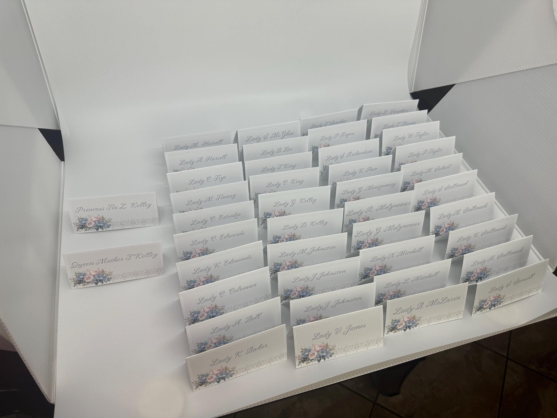 Please plan accordingly as place cards take time. When in doubt, order everyone's name. Table numbers can be added beneath the name just specify table numbers.