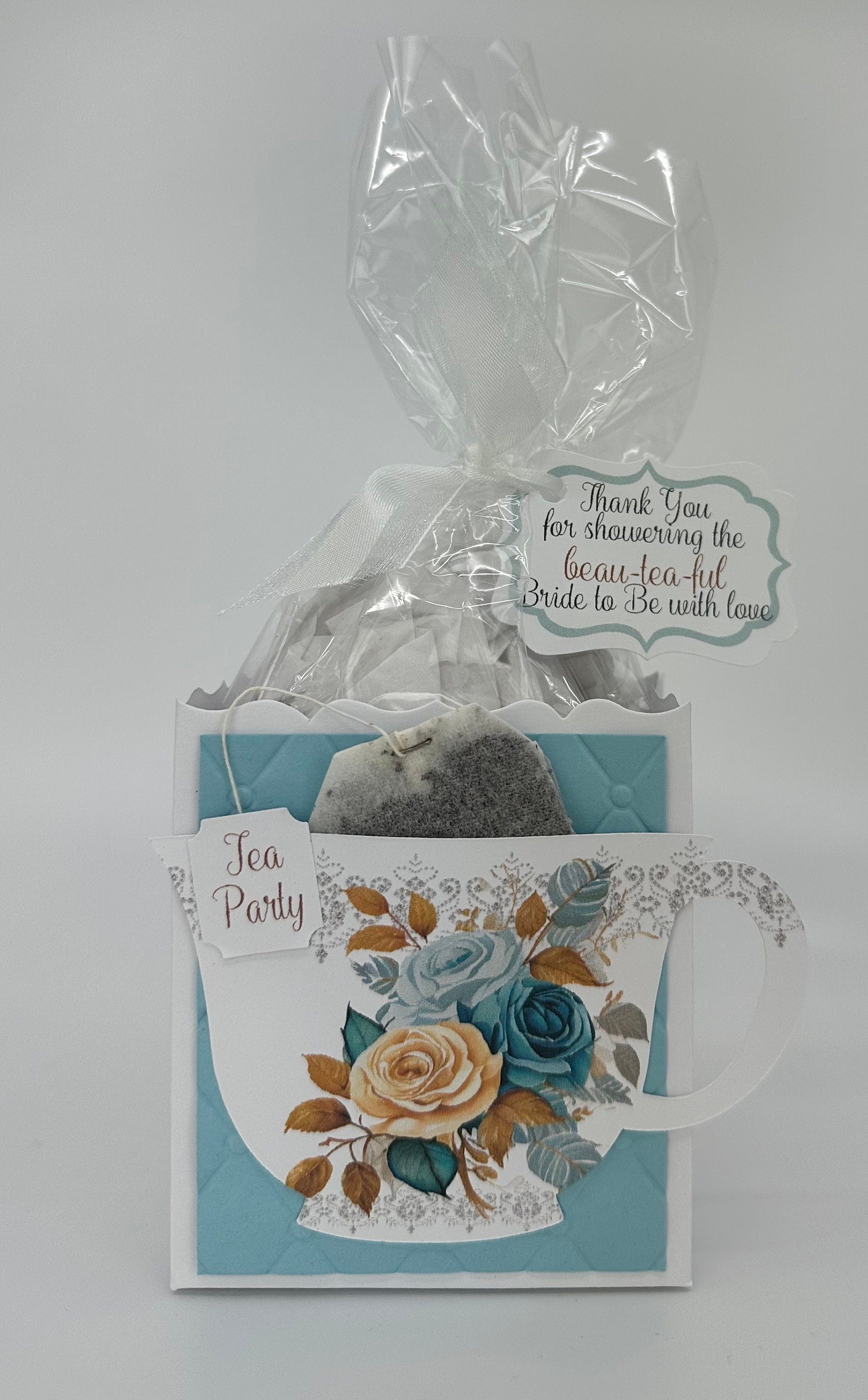 This personalized Blue Rose Bouquet tea party favor is the perfect favor to stuff with edibles or small gifts for a birthday, beau-tea-ful bridal shower or any event!