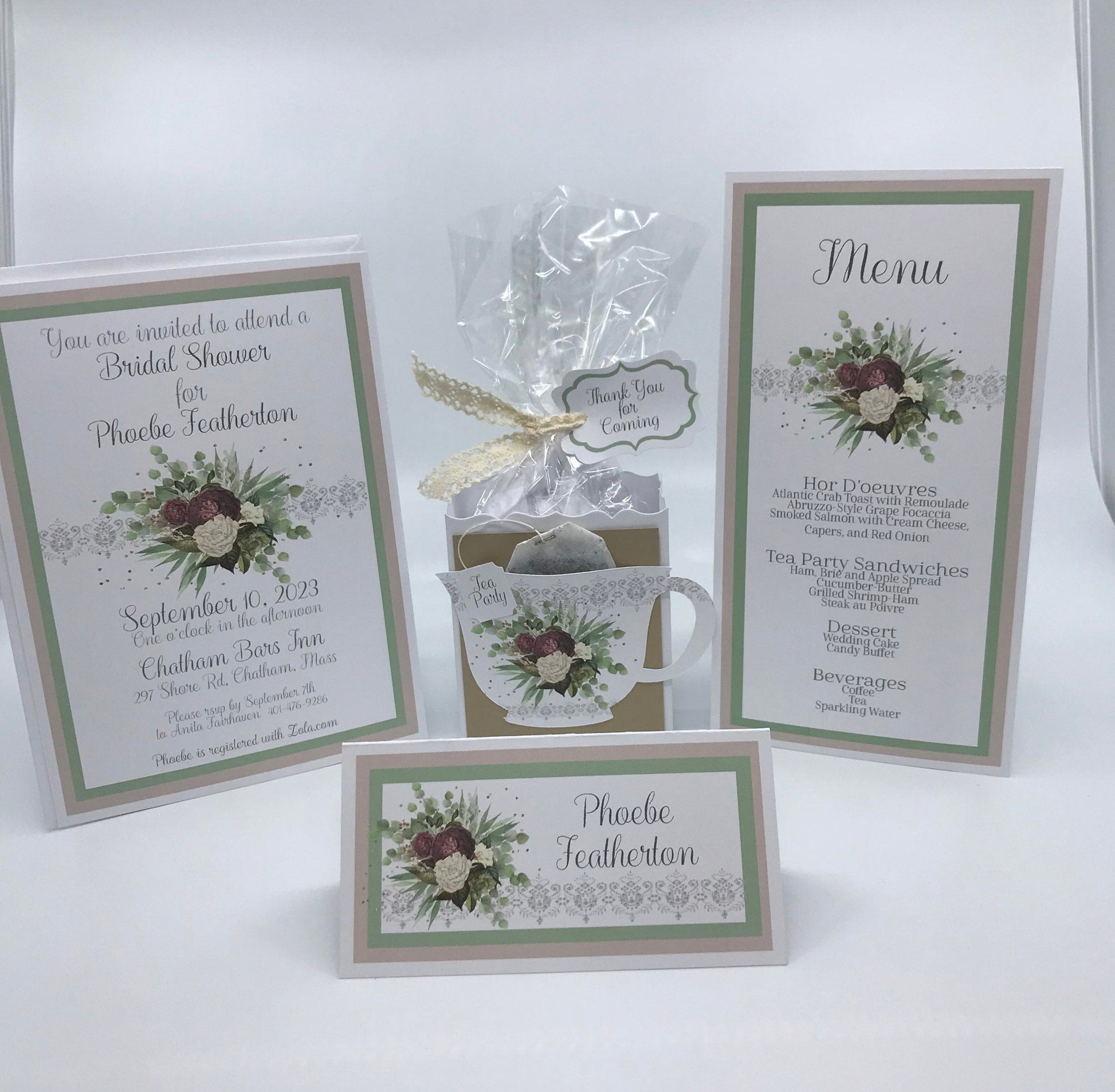 An absolutely beautiful Burgundy Cream Sage Eucalyptus floral bouquet tea party favor for a bridal shower tea party or wedding! The box is a white box and the matting behind the teacup is a crumb cake background, perfect for your event!