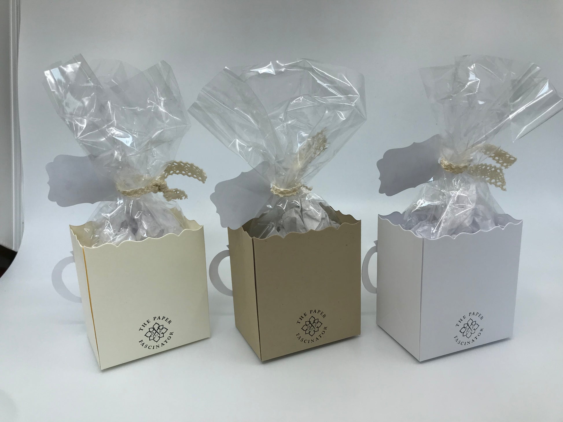 Each favor includes decorated box with digitally personalized tag, cello bag, and ribbon.