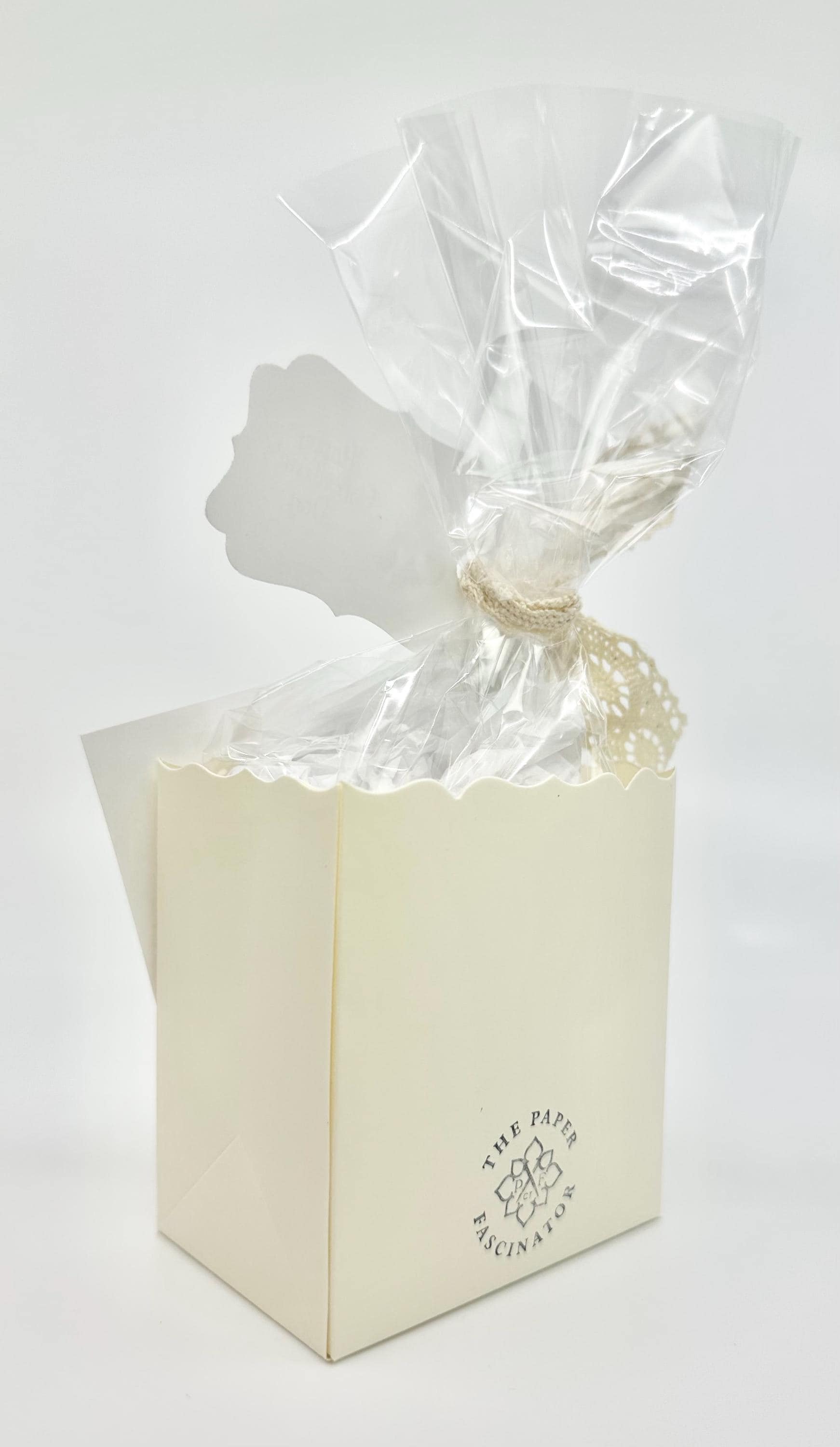 The purchase includes the box, a tag, plastic bag and ribbon that you will need to assemble: taping the bottom of the box favor, filling the bag with your goodies then typing the the tag and ribbon onto the bag. You may need to snip the ends of the ribbon to perfect the look.
