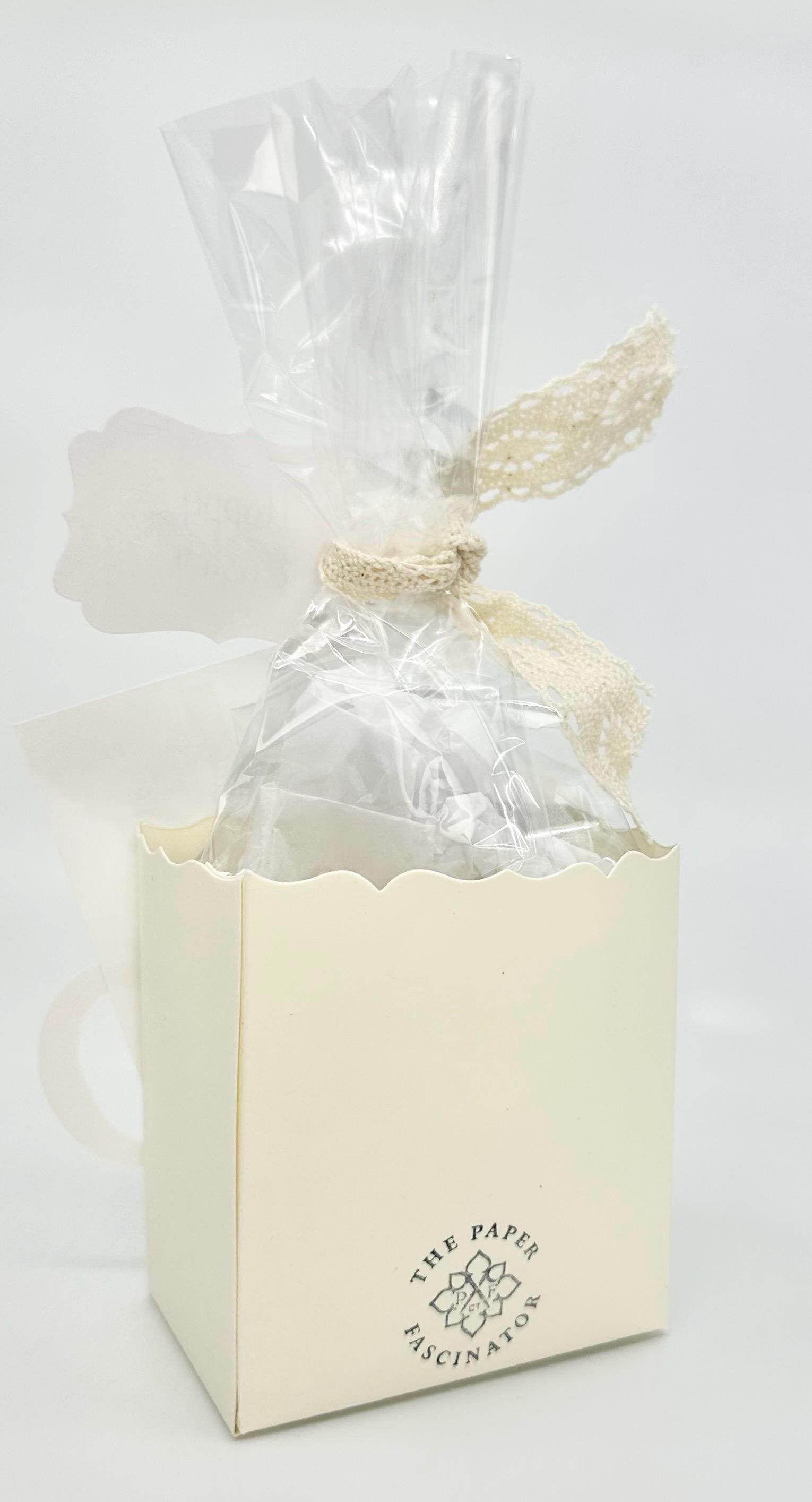 Favor includes decorated box with digitally personalized tag, cello bag, inedible tea bag and ribbon. You will need to add your own goodies to share with your guests so there is assembly to fill the bag then tie the ribbon with the tag.