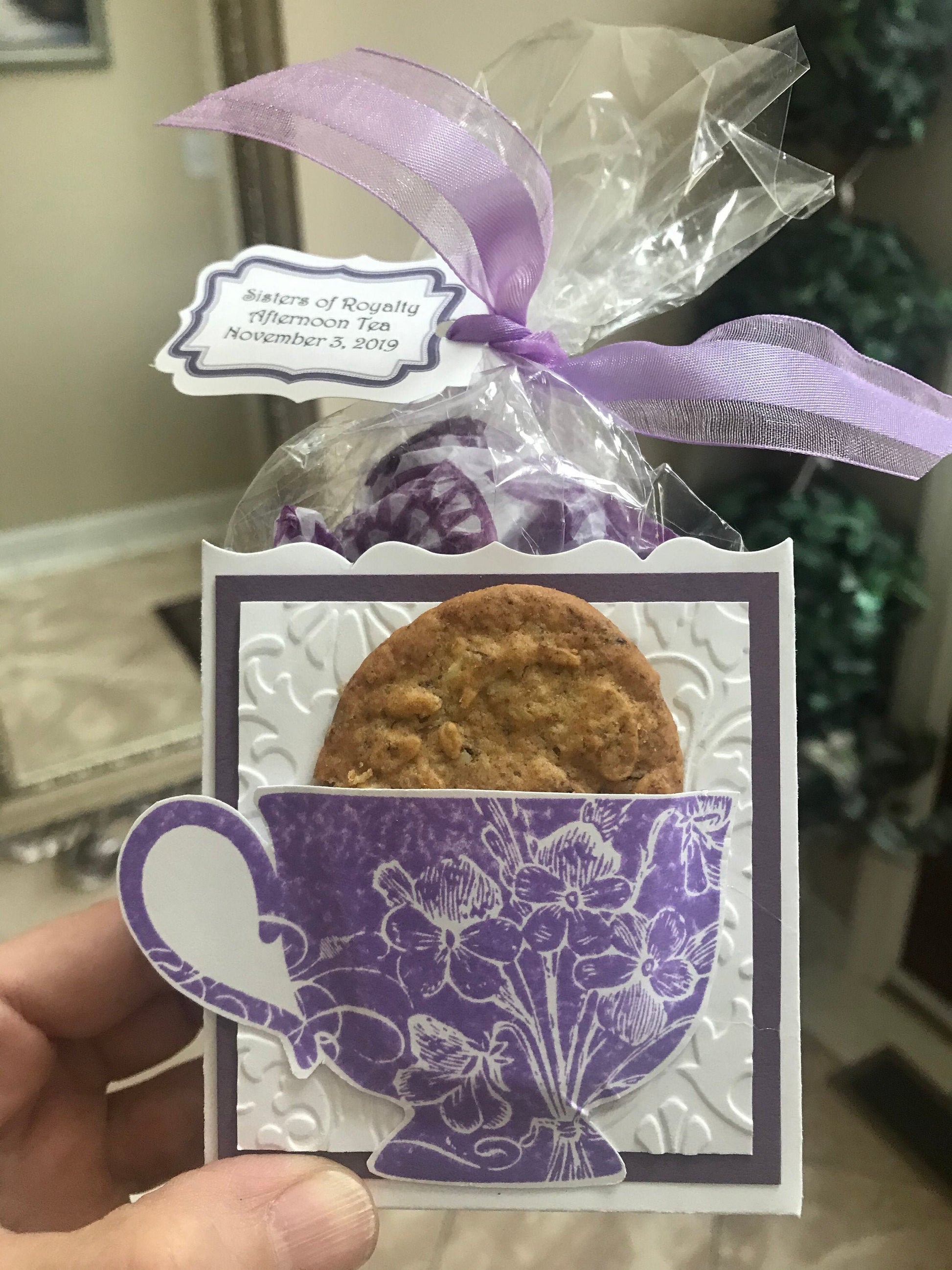 hand-stamped, hand cut tea cup in Lavender lace ink with ability to insert small thin biscuit or cookie.