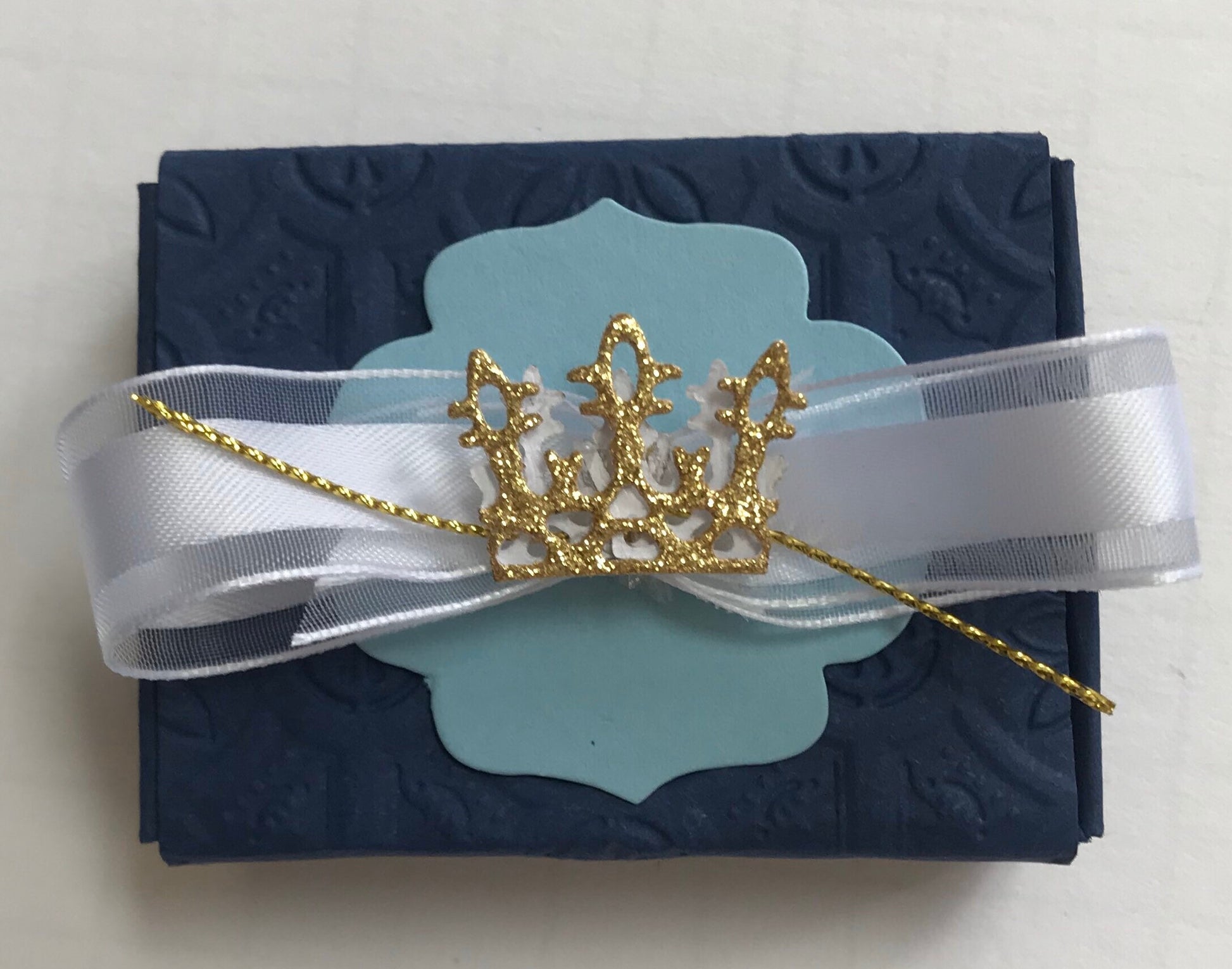 The top is adorned with a light blue die cut, satin ribbon with organza edging, gold thread and a glitter crown.