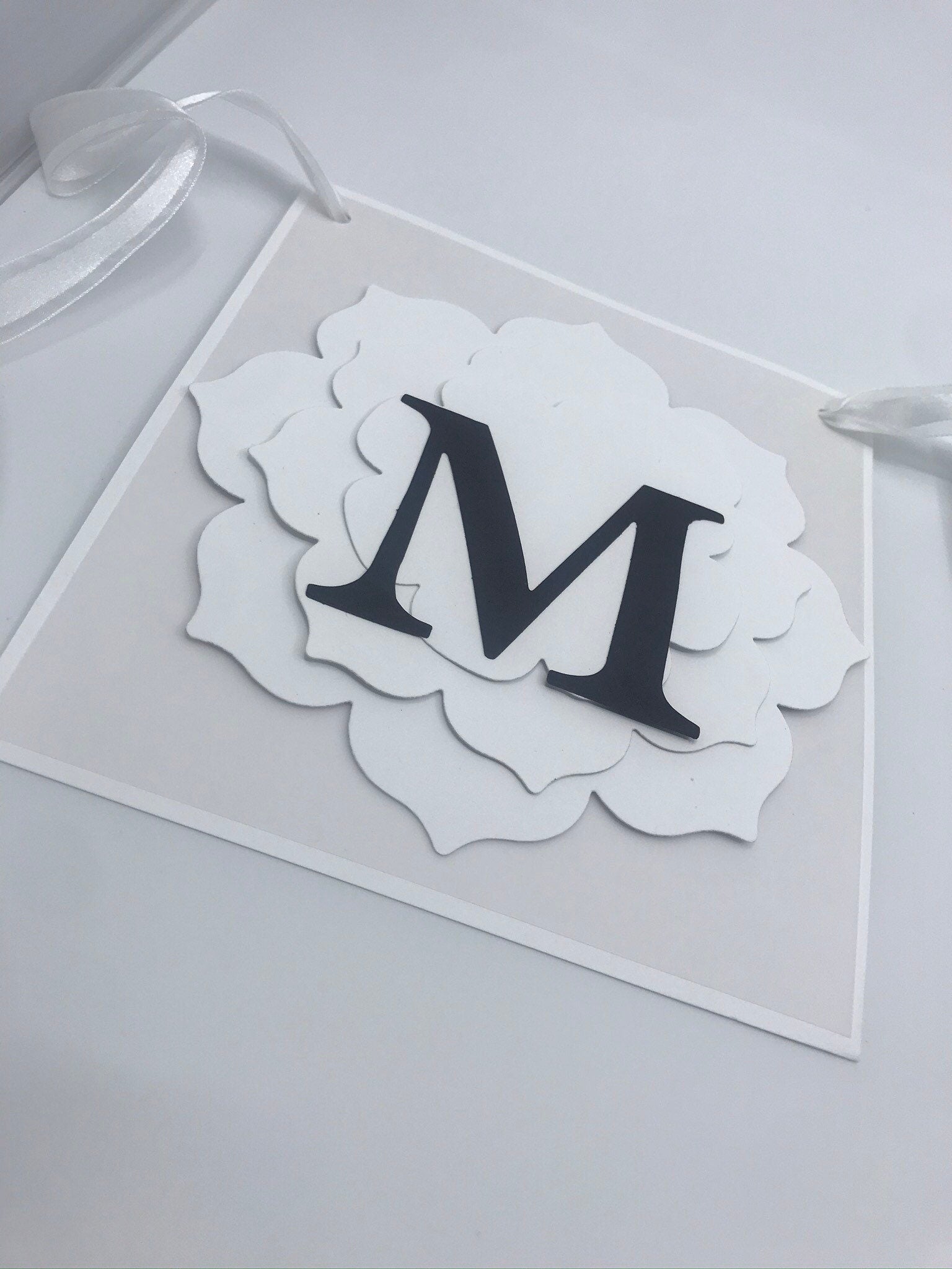 This stunning Mr & Mrs Banner / Sign is a beautiful accent at any wedding venue. Each 6”x6” letter panel is made of layers of floral die cut shapes, creating a 3-D effect, using white card stock against vellum background, and black die cut letters. Each panel is strung together with a beautiful white satin ribbon with organza edging for that elegant look. With the ribbon’s approximate length being 5 feet, this sign is perfect to hang on walls, buffet tables or tie across the two chairs of the bride and groom. The punched holes in the panels do allow movement across the ribbon for perfect positioning/ adjustments.
