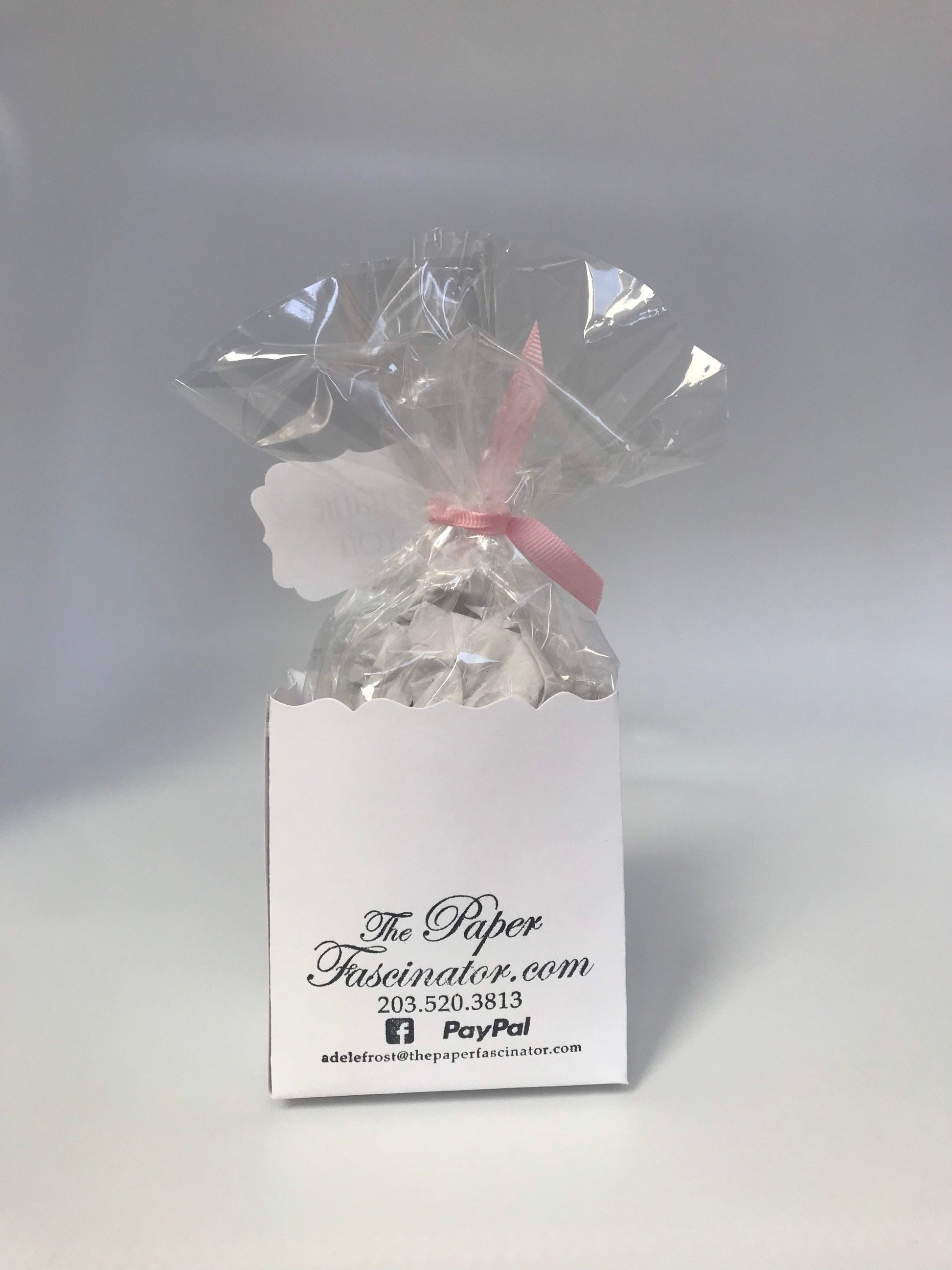 Dimensions of the favor are 3.5”x 3.18” x 2.25”. The favor bag can easily fit 5-6 medium sized cookies, half a bag of Hershey kisses or a small gift.