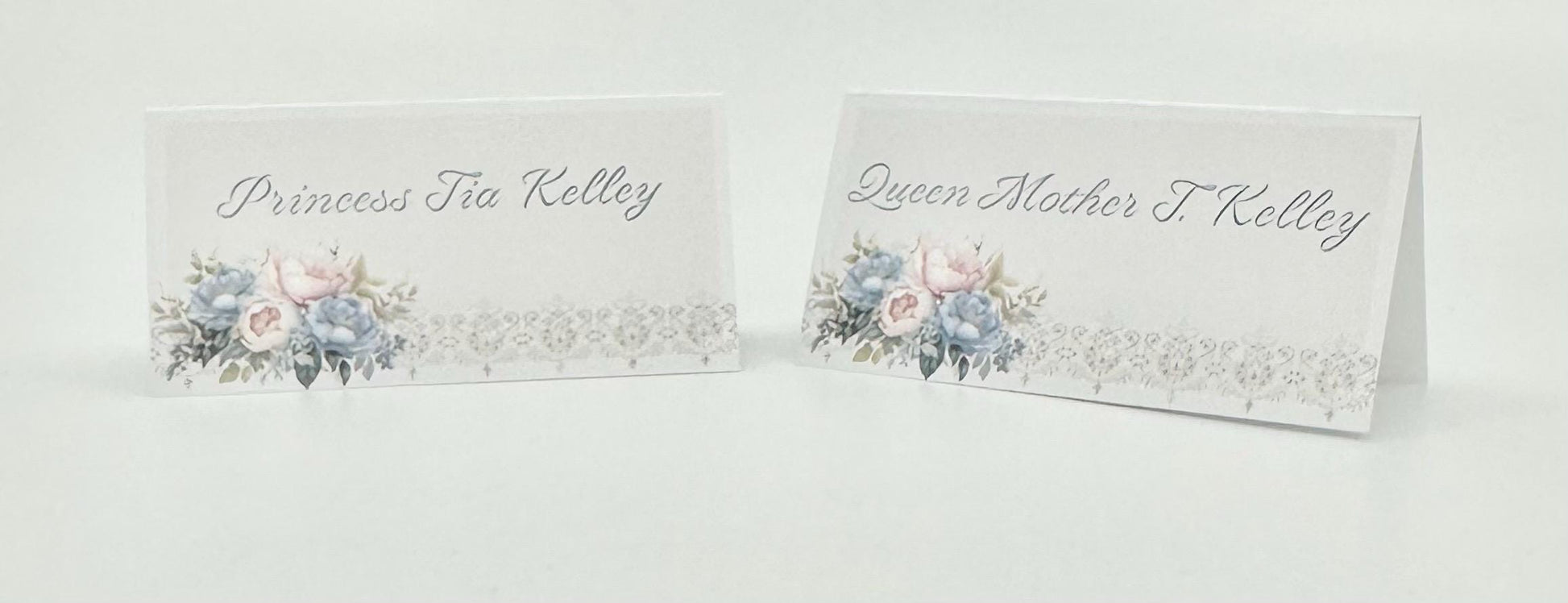 Pink Blue and Cream Victorian Tea Party Table Place cards
