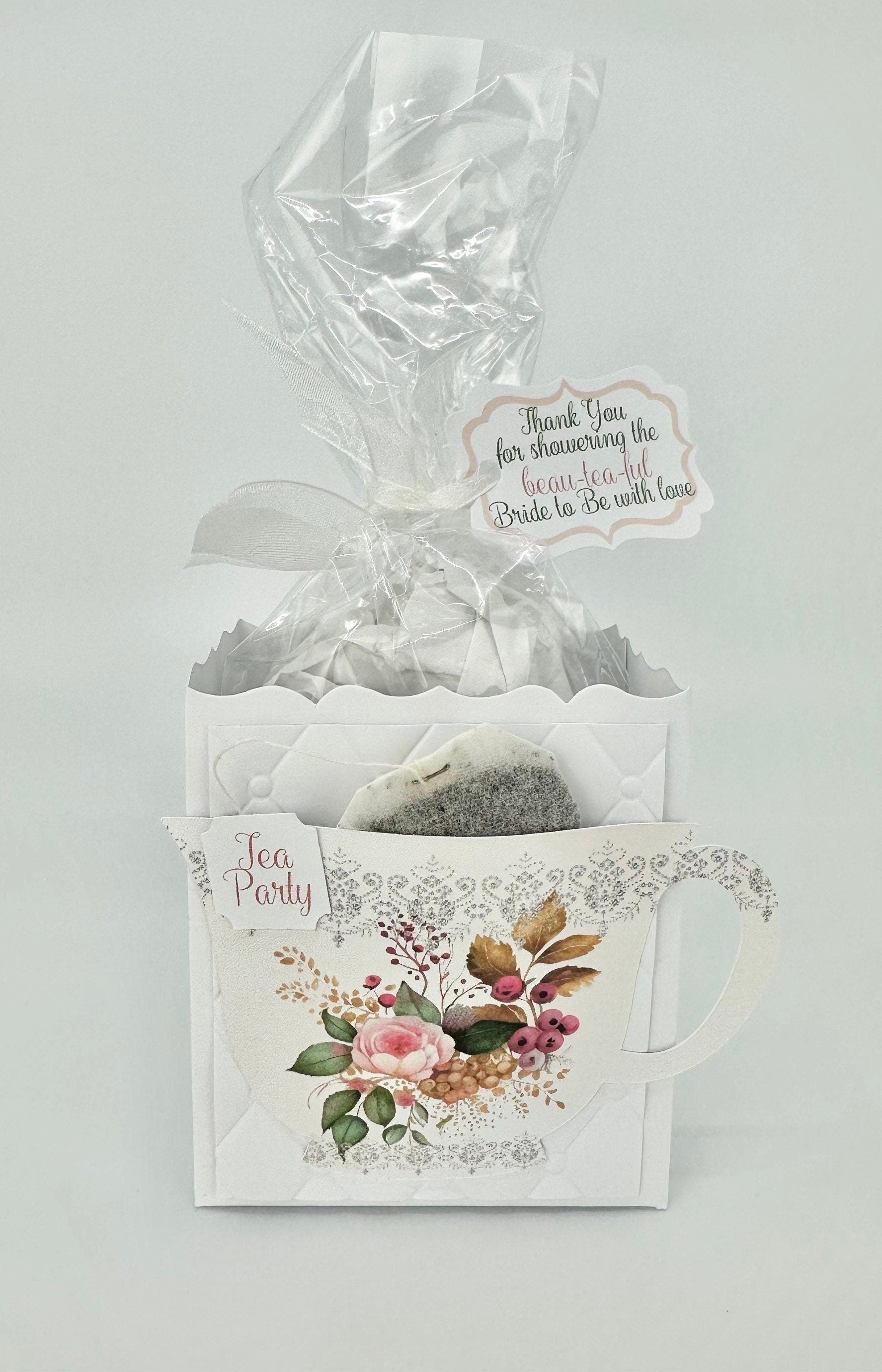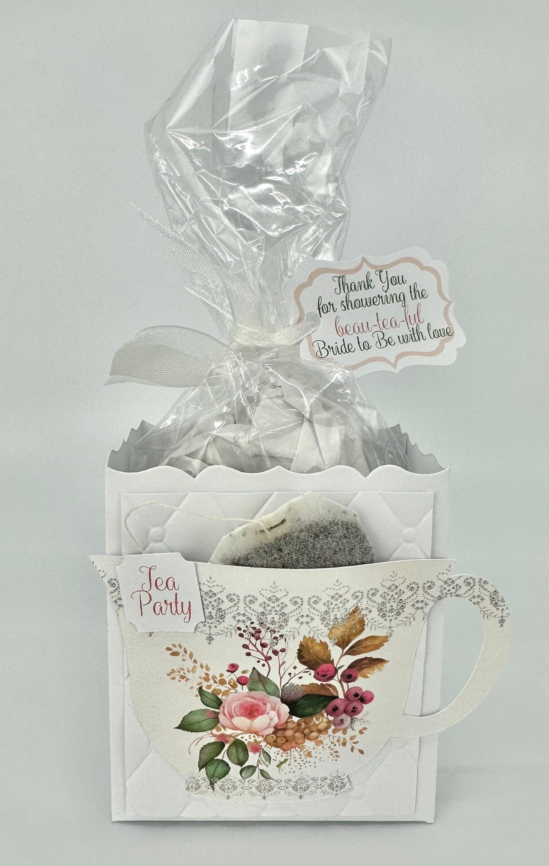 This personalized pink rose with berries tea party favor is the perfect favor to stuff with edibles or small gifts for a birthday, beau-tea-ful bridal shower or any event!