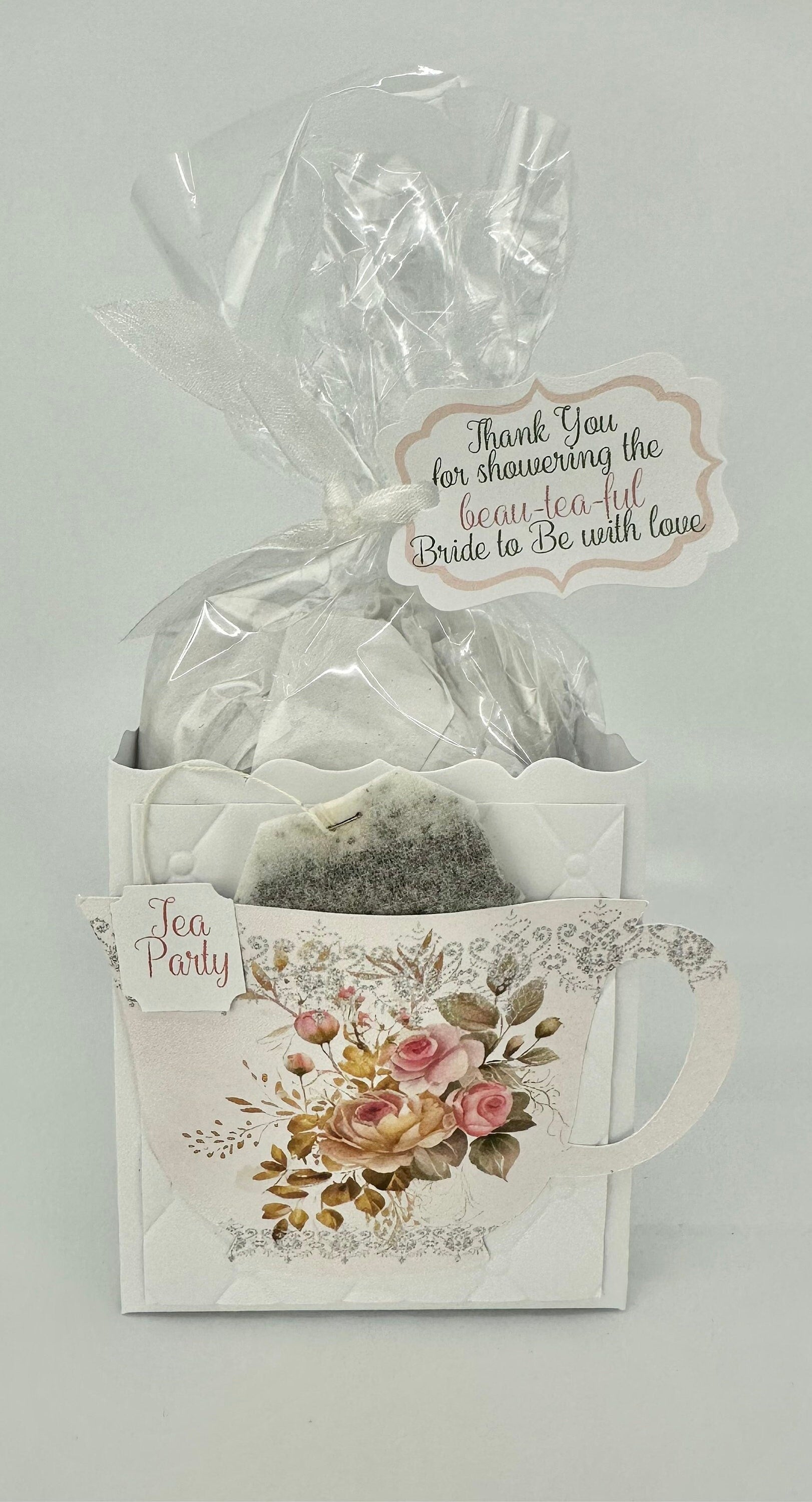 Favor includes decorated box with digitally personalized tag, cello bag, inedible tea bag and ribbon. You will need to add your own goodies to share with your guests so there is assembly to fill the bag then tie the ribbon with the tag.