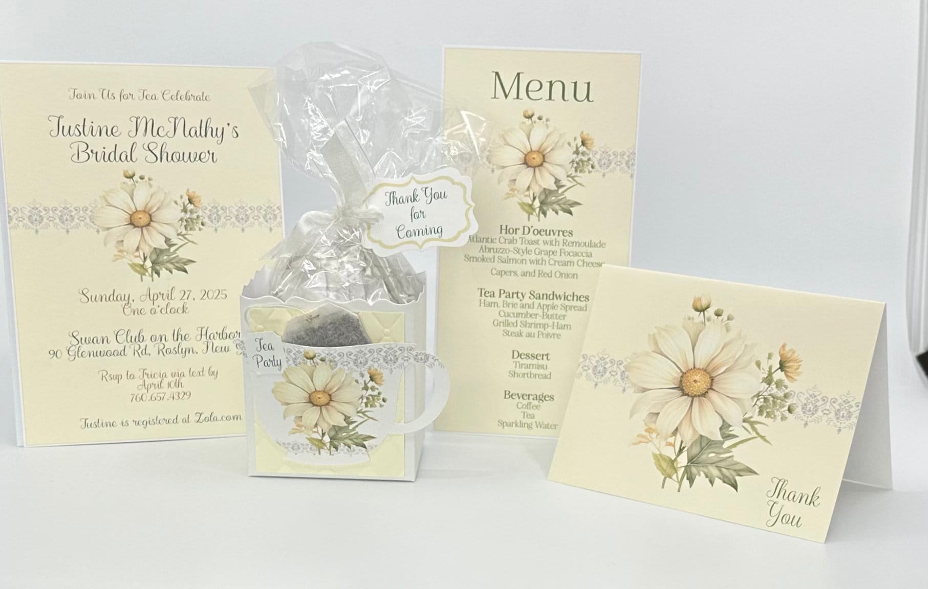 This Smiling Daisy Tea Party ensemble by The Paper Fascinator is perfect for a Bridal Shower, Baby is Brewing, Wedding, Birthday, or event planning!