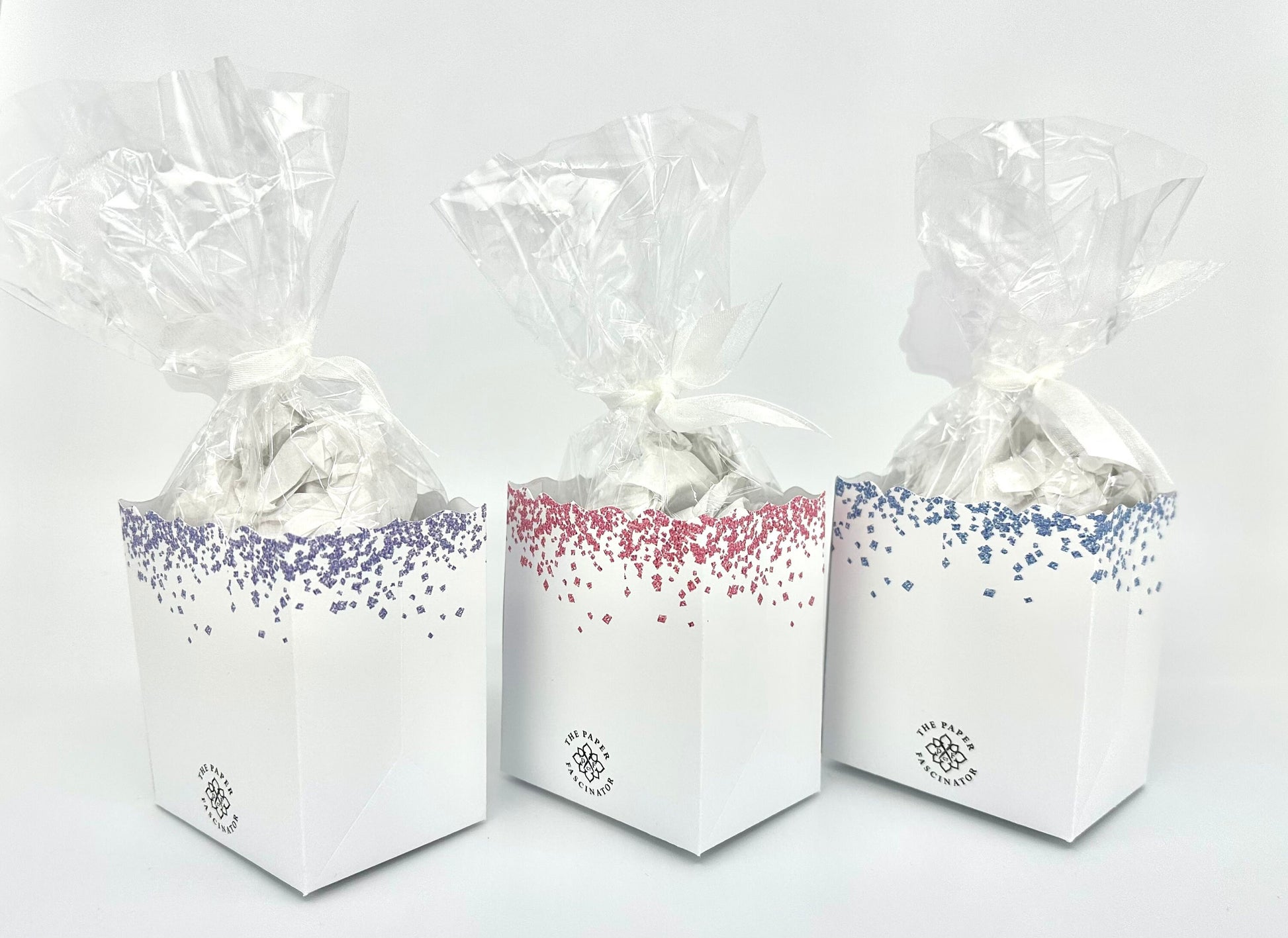 Favor includes decorated box with digital tag, bag, and ribbon. White ribbon style may slightly vary due to vendor availability.